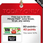 Get a FREE 10 pack of Minute Maid Juice Boxes coupons right now. They are given for just 40 points (regularly 80 points) by My Coke Reward’s. This is for today only or until they sell out.