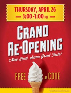 Carvel is giving away a FREE Jr. Cone to celebrate their Grand Re-Opening on Thursday, April 26th from 3pm to 7pm.